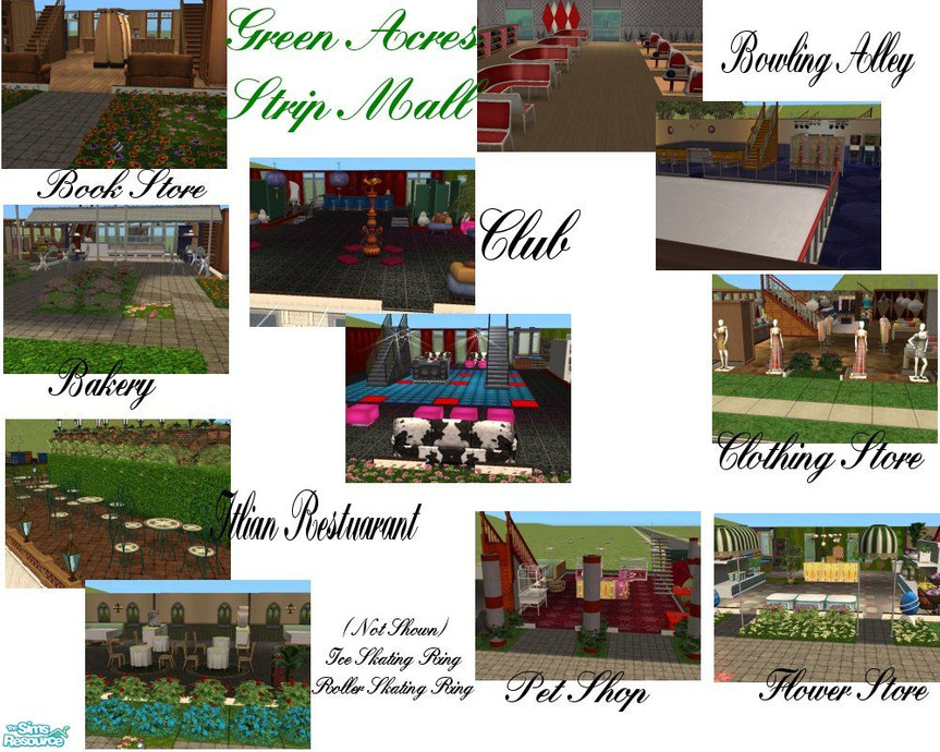 A mall that has all the sim's needs. Beautifully landscape for those that just want to stroll with their lovers. Roller and Ice Skating Rings not shown in pictures. Club, Pet Store, Bakery, Bowling Alley, Itlian Restaurant, Flower Shop, Book Store, and Fashionable Clothing Store.