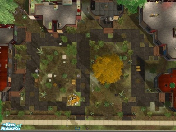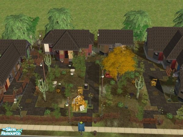 This ghost town of a shopping centre, is badly stocked, with rubbish dumped on the once beautiful lawns. Broken pavements, windows & doors make this a creepy place for sims to shop, dine or just hang out with the creepier members of the sims society. 4 shops & card-shark area with bar.