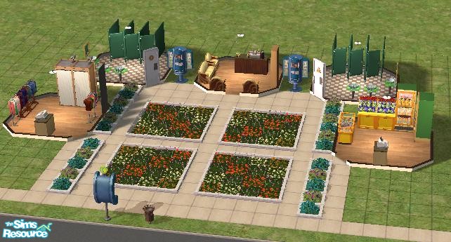 5 Coned buildings all with different uses. men's + women's bathrooms, clothes shop, food shop and coffee shop. thanks to cyclonesue for the roofs. they may be small but they have everything you need. +2 gadget kiosks outside. leave your comments and give me ideas on whayt i can make. (lots only)