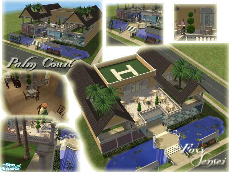 A Shopping Centre for your sims! Includes a heli-pad, elegant & romantic restaurant with indoor and outdoor seating: fit for any weather conditions. Beautful landscaping, live koi pond, hair salon, a fashion boutique, movie cinema, grocery store, flower shop,coffee shop,mini-bookshop,photo booth...