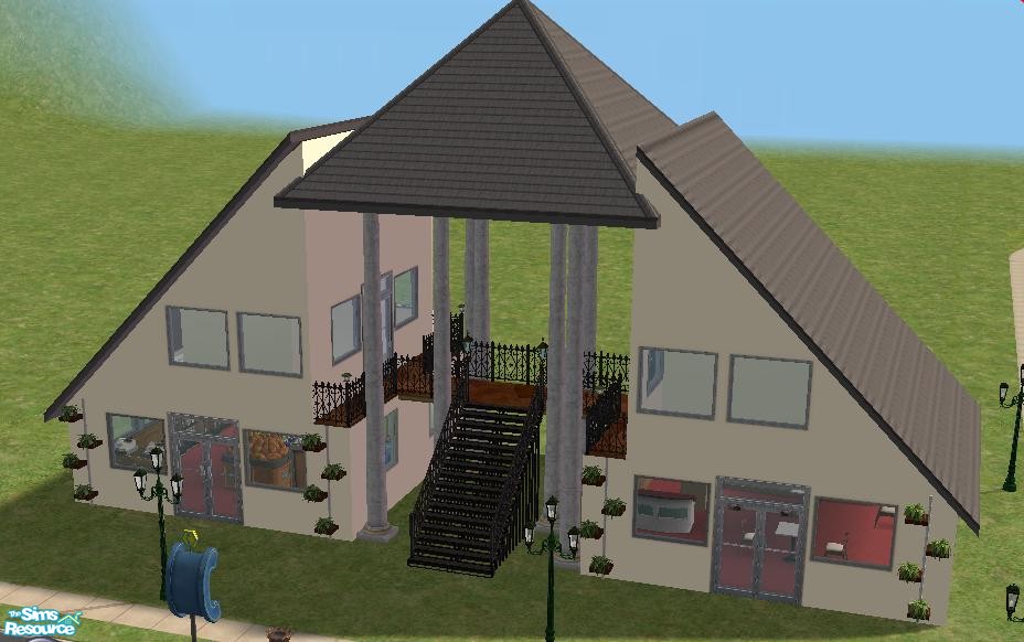 A Coffer House and a shop. It is currently furnished to suit my sims needs but you can easily refurnish it yourself. mens and womens bathrooms upstairs in the separate buildings.(small because of roof space) both buildings connected with a walkway on 2nd floor. and stairs outside in the middle aswell.