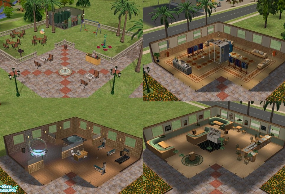 The Fountains commnunity lot is an attractive plaza which includes a small restaurant, a clothing boutique, a spa with exercise equipment and a small park like recreation area. I built this lot in the Pleasantview neighborhood but it is also appropriate for downtown.