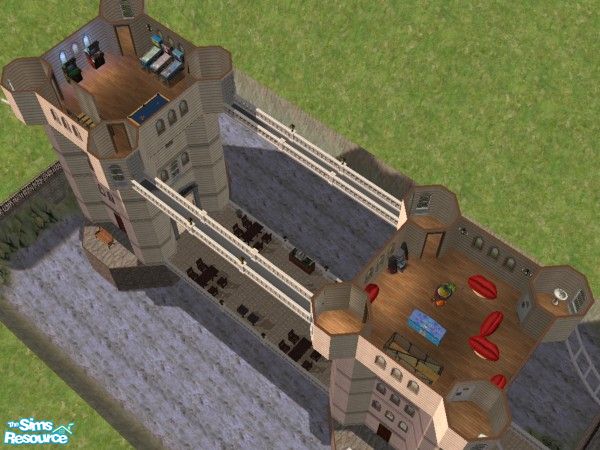 The Tower Bridge, London - just how it isn't in real life! Which is good, really, because this one has a swimmable River Thames - eek! Mainly Maxis, but includes stone steps by Brasstex (also available to download free from ModTheSims2) and my rock and water terrains.