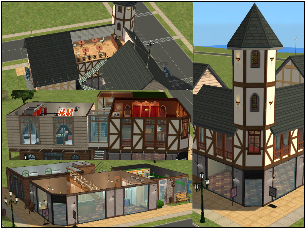 A 2-story clothing store featuring H&M style. Plus a small grocery store, gym, and rooftop cafe.