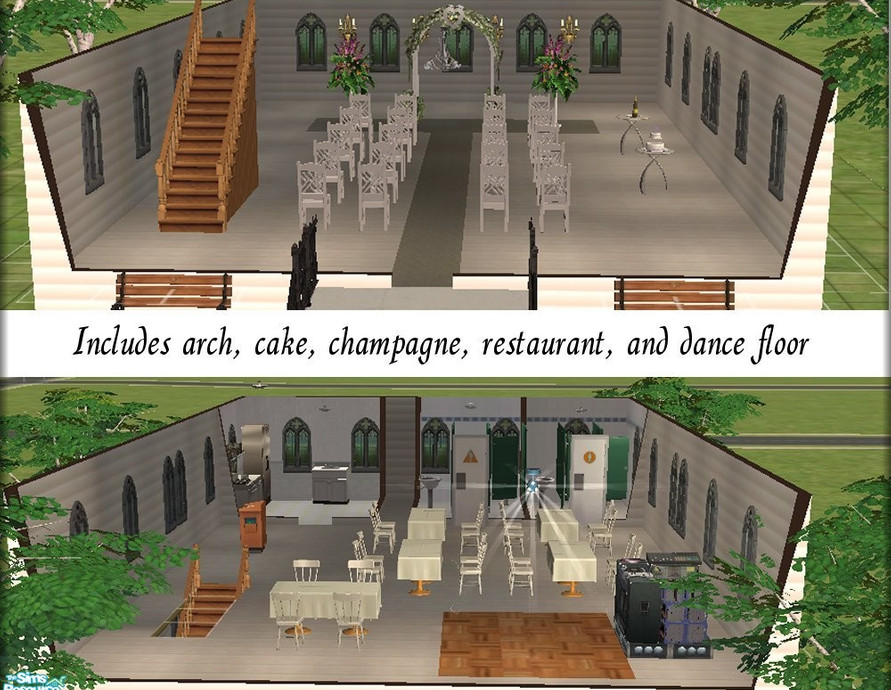 Come get married in style! This chapel includes a wedding arch, champagne, a cake, a dance floor with DJ, and a restaurant. Custom walls and floors by me or other TSRAA artists.