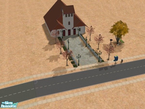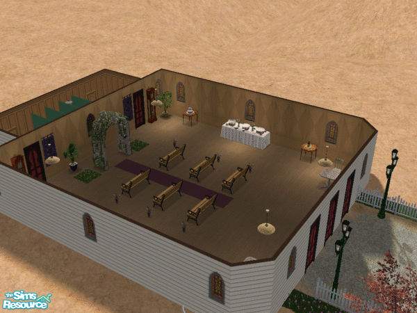 Wedding chapel and reception all in one. Someone else made a chapel, but I couldn't find it, so I made one. Thanks to yuppiesims.com for the community-enabled objects (coffee, cake, buffet table, etc). Includes outdoor picnic area, indoor bathrooms, and entertainment.