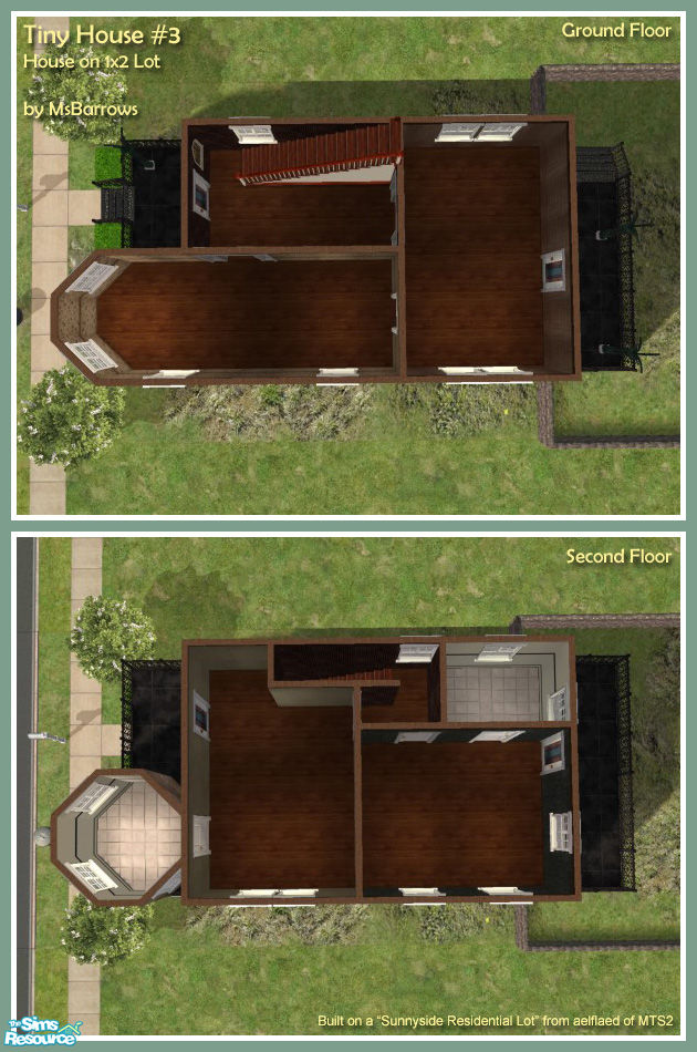 A tiny starter home on a very tiny lot! This aged and modest dwelling sits on a mere 1x2 lot. It has a large eat-in kitchen, small living room, downstairs and upstairs hallways, two bedrooms, and two baths. Also porches and balconies in both front and back, and a postage-stamp sized back yard.<br><br>Base game compatible!