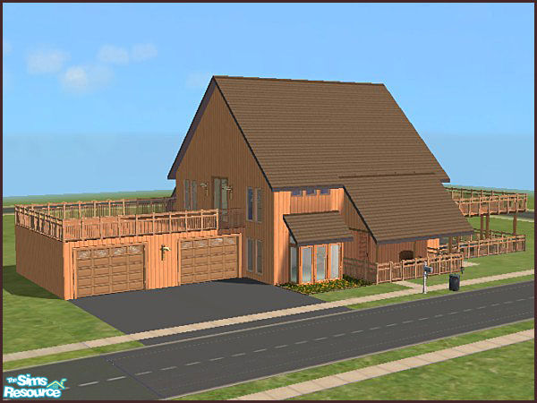 Lots of natural wood and warm earthtones make this house the perfect abode for a nature-loving sim and family. Two large upper level decks offer outside play space and plenty of yard left for a pool and garden. Maxis only content.