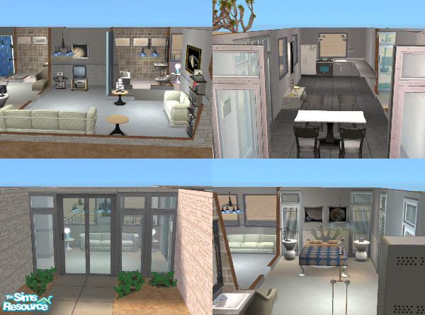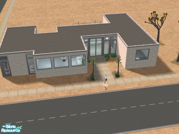 A rather odd little space-age house. One bedroom, two baths, strangely shaped but fun to play. Includes custom art, including some not published separately. A great second house for a couple or well-off single Sim. Back patio includes grill. No hacks! Note: requires University.