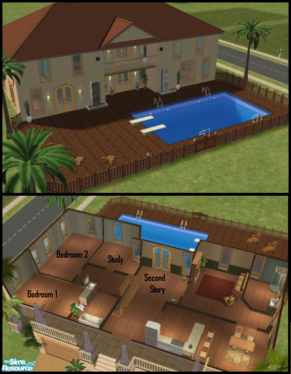 A perfect home for the coastal-minded sim. The Mediterranean Villa home comes with a driveway and garage, a large patio, and refreshing pool. The downstairs area has the makings of one bedroom and bathroom. Use the rest of the space as you choose. It could make a great party area for sociable Sims.