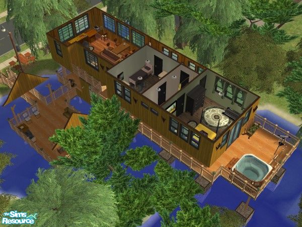For Cajun Sims, a home back in the bayou. Built over swamp waters (watch out for gators!), the 1st floor is a spacious deck perfect for parties. There\'s even a place for Sims to dock their boat. The 2nd floor (above hurricane floods) provides a cozy living space with a hot tub on the back deck.