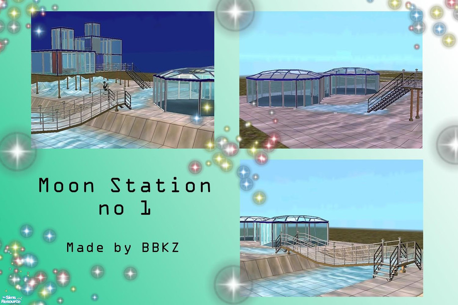 Moon terrain (blue and grey) made by me. Glass roofs made with transparent floors (MissyZ) and blue fence (Cyclonesue). This Moon Station has glass apartment with kitchen, bathroom, diningroom, livingroom and bedroom for 2 Sims. There are 2 science rooms next to Moon apartments... Bridge made using Tiko's tutorial... Enjoy!
