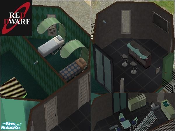 With \"cockpit\" (TV room), rec room, galley, bedrooms (one twin, one double), and bathrooms. Parked on a rugged, rocky plain. I have tried to design this using only items from the original game (no EP or custom items), so please let me know if you have any trouble installing it.
