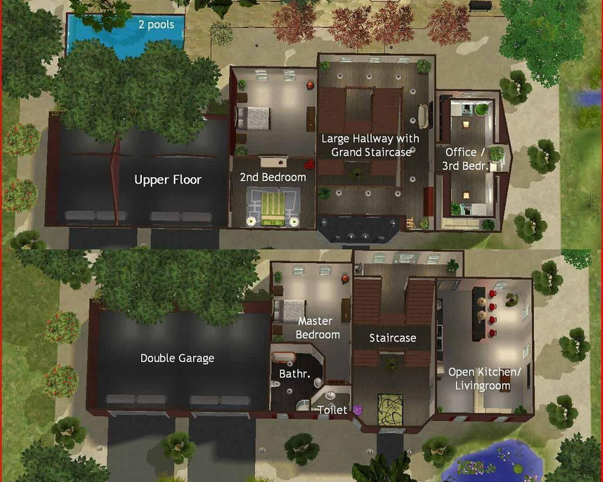 Fairly large villa with 2 double beds. There\'s a 2 car garage, a grand staircase and a spacious kitchen/living. Upstairs there is a room which is currently decorated as an office, but can easily be transformed into a 3rd bedroom. The garden has a seperate BBQ area and plenty oftrees. (Car not incl.)