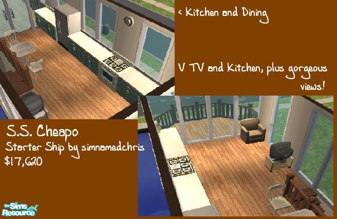 Here's a starter ship for your sims. Christened the "S.S. Cheapo", it features 2 bedrooms, a bathroom, foyer and upstairs living/dining/kitchen area all for the low price of $17,620!