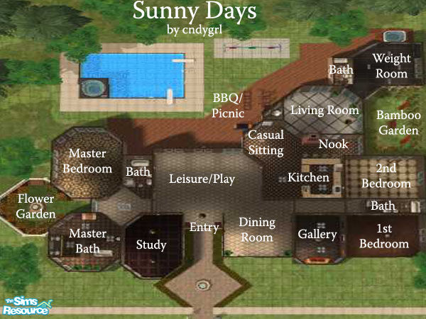 This property features a weight room, gallery, study, a casual sitting area, a formal living room, a kitchen nook, formal dining room and game/leisure room. Outside features a bbq/picnic area, swimming pool, a flower garden and a bamboo garden. Pricy--but isn't your Sim worth it??? :)