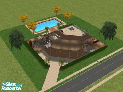 Very big, uniquely shaped house. Even though it appears to have stairs it is only one floor, and contains a chimney, in-ground hot tub, swimming pool, barbecue and a sitting room connected to the master bedroom.