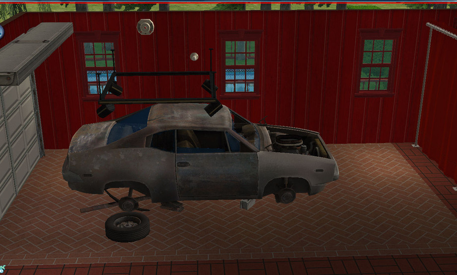Located in a wooded area this house is for the sim who loves to tinker The entire 1st flor is a 3 car garage w/broken down cars & tools! Upstairs consists of 2 bedrooms, 1 bath, a lg kitchen & a livingroom + sittin area w/fireplace at the top of the stairs! Outside is a pool & basketball court! Enjoy