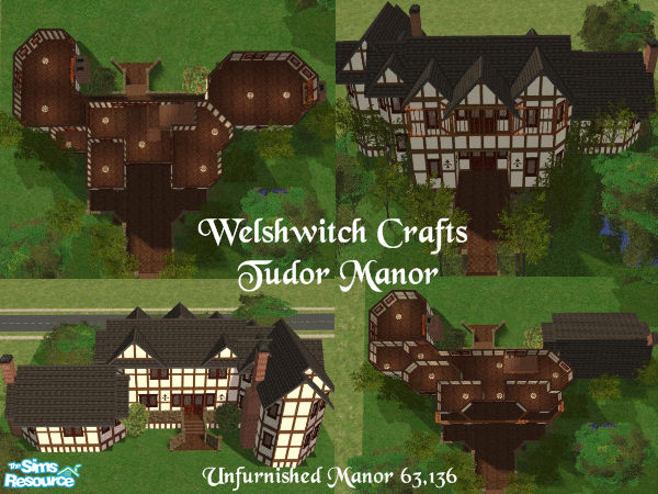 Beautiful Tudor Manor. Unfurnished. This medieval style manor is perfect for your sims. Pond area and gardens. Lookout above the entrance. Maxis Content Only.