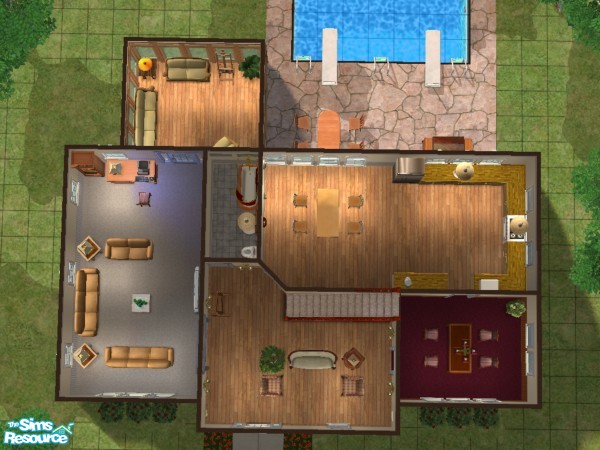 This old 3 bedroom, 3 bathroom house would make a great home for a medium sized sim family. It features a large kitchen, bright sunroom, and plenty of seating in the family room for entertaining. Also includes an outdoor pool and patio area, complete with landscaping.