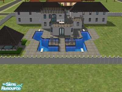 3 bedrooms, 2 double garages. 4 bathrooms. Covered and uncovered balconies with spa area at the top of the house. Pool and patio area for entertaining guests. Combined kithen/dinning. 2 lounge rooms. Internal access through garages. My first "real" try at making a half decent house.