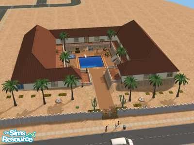 I wanted to build a large villa around a central courtyard and this is what came out! There is an open plan kitchen/dining/living area, with 3 bedrooms and 3 bathrooms. There are plenty of activities here to keep your Sims and their neighbours entertained.