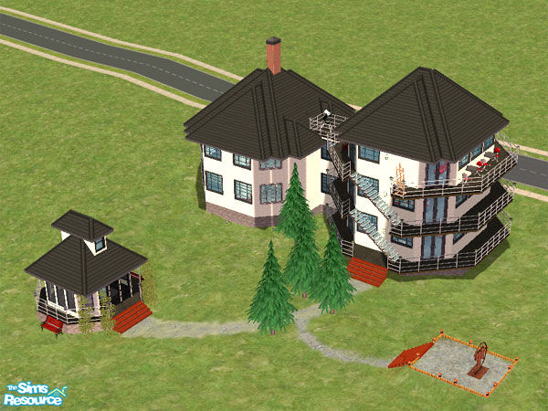 A modern, Asian-style design. Elegant grey monochrome with red accents. Fully functional house plan. Furnished and ready for your Sims to move in (perfect for a family of four.) Has all the necessities and many extras, including a hot tub in a secluded gazebo and a meditation garden.