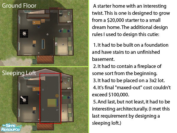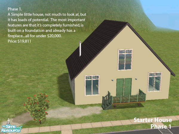 A unique starter home designed for growth. Phase 1 (this house) is the beginning with a move-in cost of under $20k. Read about this project and see more pics at http://forums.thesimsresource.com/showthread.php?t=277635. The final phase is also available here as "Small Shingle w/Loft BR." There are 2.5 floors in this home.