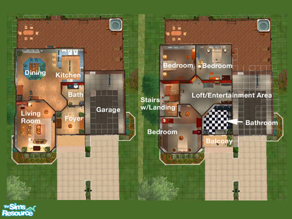 This traditional 2-story home with interior L-shaped stairs was built as the result of a thread in the House and Home forum (http://forums.thesimsresource.com/showthread.php?t=264926). The home has 3 bedrooms, 2 baths, living room, dining room, upstairs entertainment lounge and two-car garage.