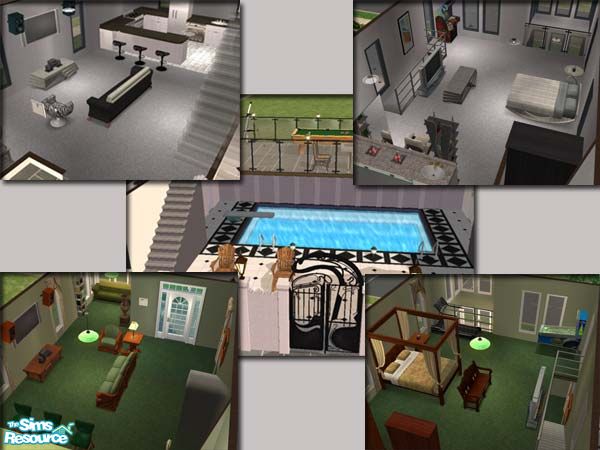 Twin townhouses, fully decorated & furnished. A deck on the second floor connects them w/ a pool below. Each TH has a bedroom & 1.5 baths. All maxis objects, no hacks or other debris. Requires University for some of the objects.