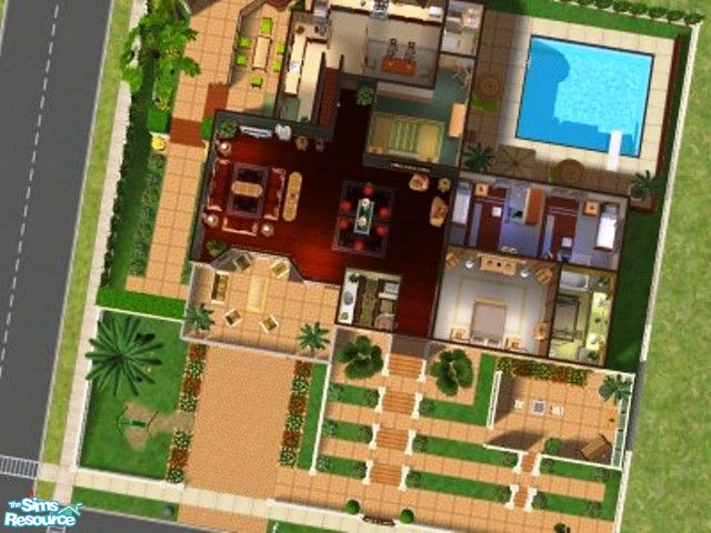 This is a house with 3 bedrooms, 3 bathrooms, kitchen, dining room, underground garage and music room. It is based on a 3x3 lot. Maxis furnishings. It also has a swimming pool and a sunken garden, Patio and BBQ area. Ideal for turning it into your Sims holiday home. Hack Free!!