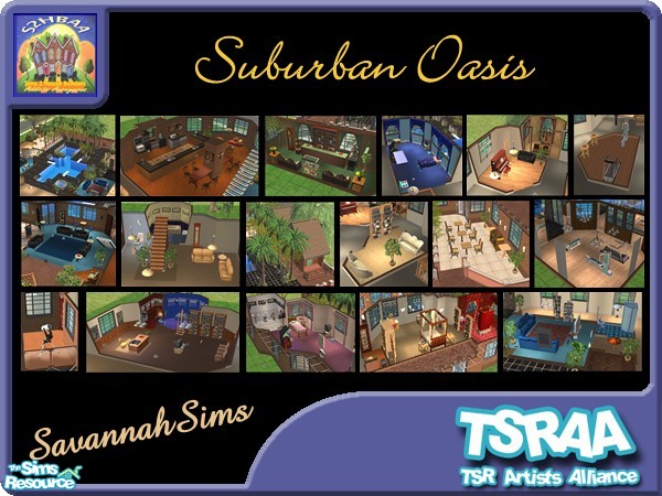The Suburban Oasis feels like a holiday resort with its expansive pool and patio areas! Let your Sims relax in style around the pool. It even has it's own outside loos! Includes 3 bedrooms, 7 bathrooms and is fully landscaped. Big thanks to MissyZ for her see-through floor tile! Happy Simming!
