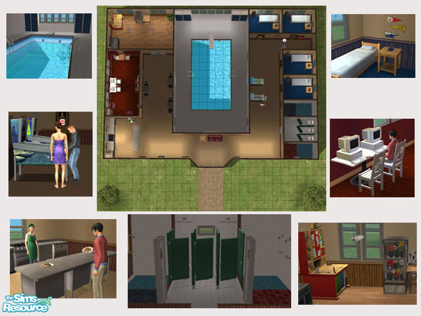 If you don\'t like sharing with too many other sims, this is an ideal small dorm with only 4 bedrooms but plenty of facilities. It has the usual dining, bathroom and study area plus an indoor pool and crafting room. All skill building items inside. There are also a few apple trees outside. Maxis only.