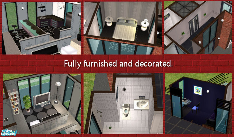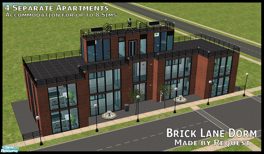 This university dorm complex holds 4 modern, matching separate apartments that can home either 1 or 2 Sims per apartment. Save on Simoleons by sharing! Built on the smallest lot from reclaimed bricks and remelted tar. This lot includes 2 computer rooms. Made by request.
