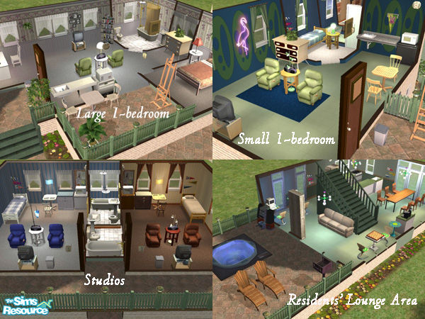 The convenience & economy of a dorm - the comfort & privacy of an apartment! Apartments: 2 lg 1-BR, 2 sm 1-BR, 4 studios;all have kitchenettes,private baths. Residents' lounge area w/kitchen,dining,games,music,gym,study area,hot tub. Hack free, no custom content. Also available as residential lot.