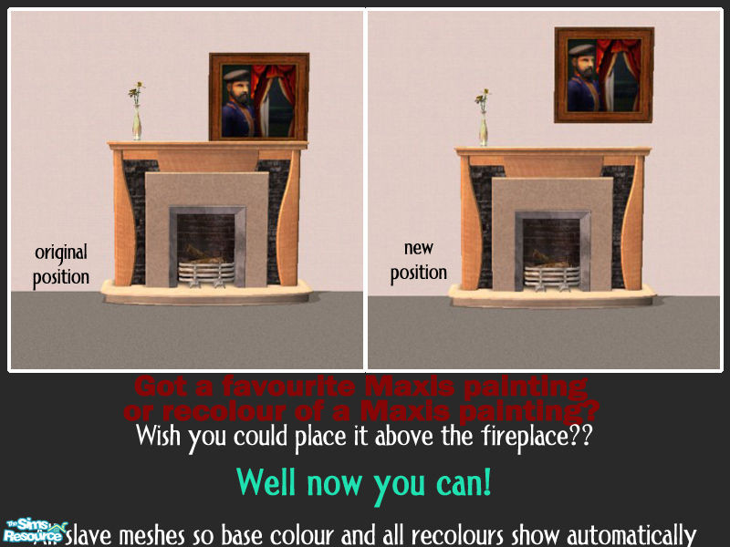 After making the fireplace for the African Safari set, I realised not many Maxis paintings can sit above it. So I have created slave meshes of some Maxis paintings and adjusted their height so they sit above the fireplace and not in it. All recolours will show automatically. (boolprop cheat required to centre some)