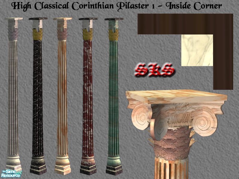 1 story classical Corinthian corner Pilaster featuring a triple crown of acanthus leaves & corner angled volutes atop fluted marble columns in 5 types of marble. Tucks nicely into inside corners. By: SKS
