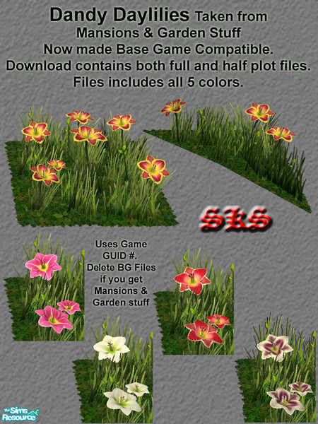 These \"Dandy Daylilies\" are actually clones of EA game originals extracted from Mansions & Garden Stuff & Converted to Base Game compatibility. Download contains 2 object files: 1 full tile & 1 \"corner\" half tile. All original color options included for each. SKS