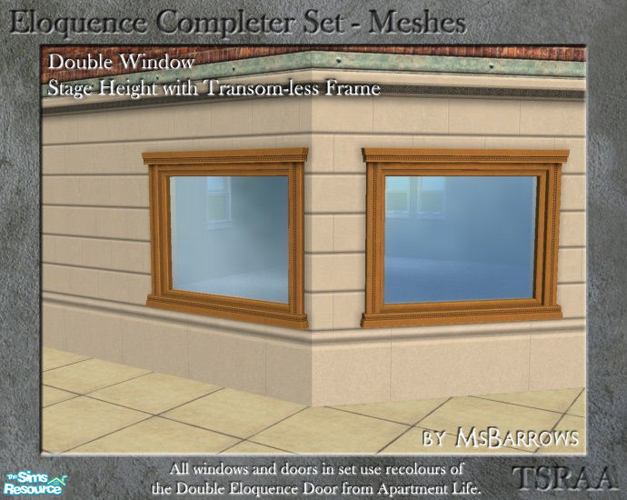 Doors require both a straight and a diagonal mesh file to work correctly. Single-width glass door in ornate frame is master mesh for sign recolours.
