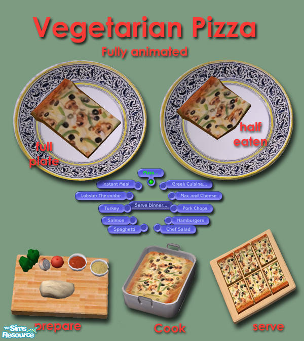 veggie & cheese pizza. Requires 6 cooking, available all day as group meal. Shows under it's own category, "Pizza". NOTE: custom serving block and dinner plate are required!-see red "required items" link