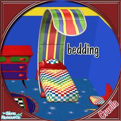 Bright multi-check bedding with red sheets to match the red metal framed bed with red, green, and blue stripe loft. Fun for Sim kids and Sim kids at heart. Made especially for May "Nursery Time" Theme.