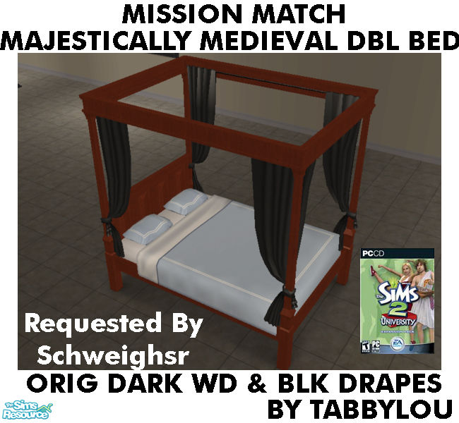 Maxis Original Dark Wood & Black Drapes Recolor of Majestically Medieval Double Bed Frame & Drapes in Mission OFB woods and my wood recolors. All Medieval Items/Objects requested by Schweighsr. Requires UNI EP. Enjoy!