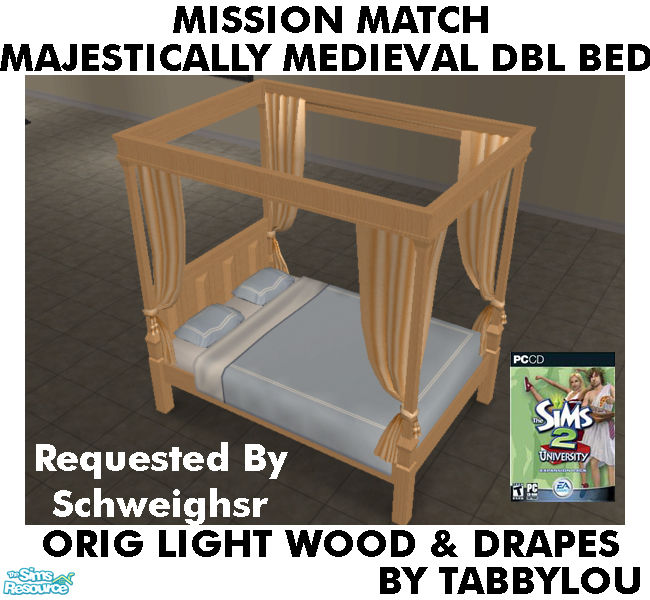 Maxis Original Light Wood & Light Drapes Recolor of Majestically Medieval Double Bed Frame & Drapes in Mission OFB woods and my wood recolors. All Medieval Items/Objects requested by Schweighsr. Requires UNI EP. Enjoy!