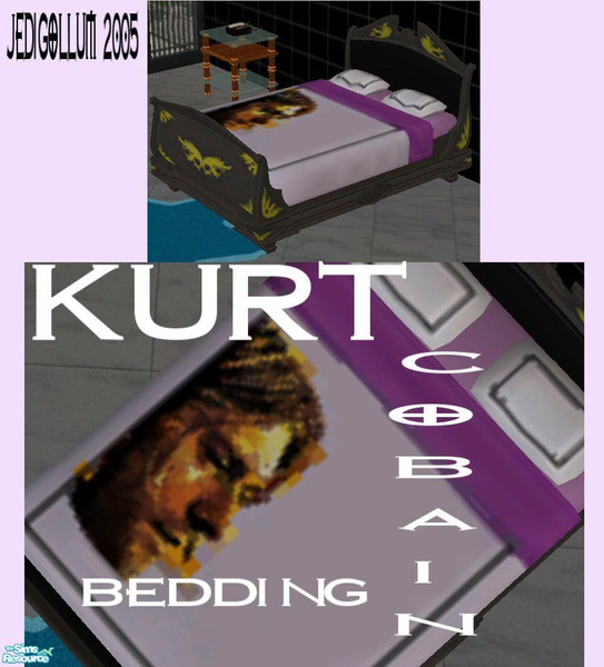 In a nice shade of purple with a handsome picture of Kurt Cobain ontop, this bedding is what all the rocking sims need. If they like purple. Works on both single and double beds. BEDDING ONLY.