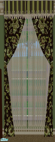 A dark green print floral curtain with light green floral valance.