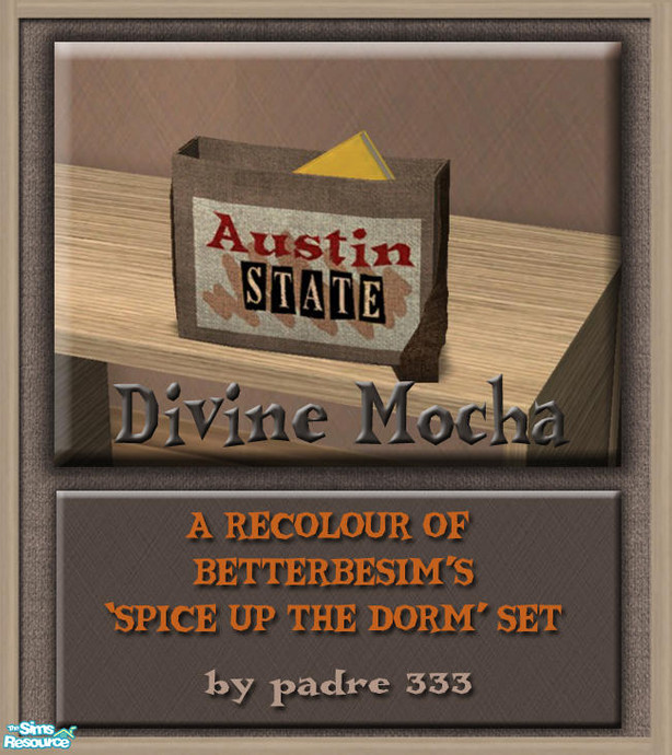A dorm set in mocha brown with light wood and a tiny splash of blue and chocolate to soften. A recolour of the amazing (!) "Spice Up The Dorm" set by the oh-so-brilliant BetterbeSim! Austin State Bookbag