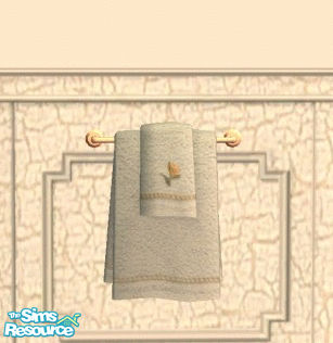 These cream and peach towel set are a part of the "Lovely" Kitchen set. The towels on the rack have a little peach lilly on the small towel.(A little bit Shabby Chic...a little bit Country.)REQUIRES: Expansion pack.
