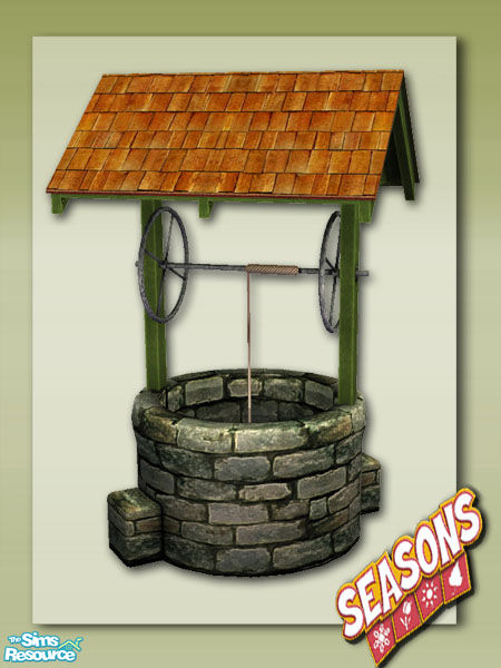 Part of the Seasons Wishing Well Set, now buyable from the catalog in the Decorative Misc Category, pulls all it's textures from the Maxis Original, set also includes several recolours of the Maxis Original.