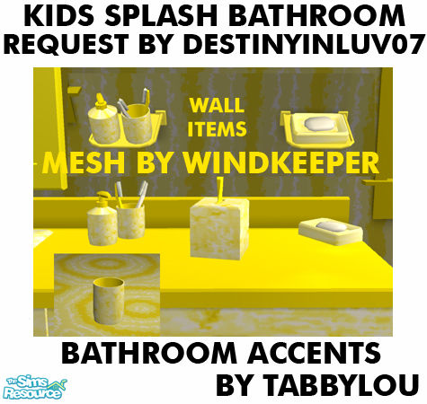 Recolor of Windkeeper's Bathroom Accessories set in a yellow version of the Kids Splash Bathroom SpongeBob Blue requested by destinyinluv07. Enjoy!