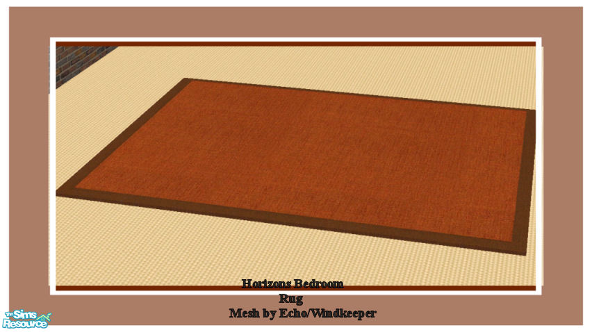 Rug for the horizons bedroom set. Requires Echo/Windkeepers's 3x4 rug mesh to work, which is free and in TSR archives. Found under Decorative Misc.